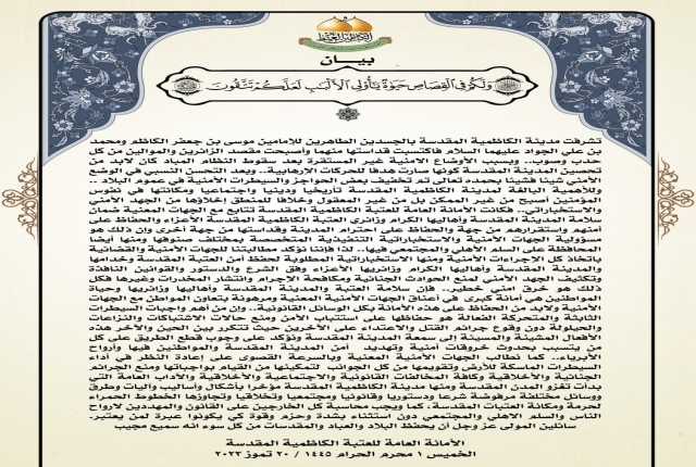 تشرفت مدينة الكاظمية المقدسة بالجسدين الطاهرين للإمامين موسى بن جعفر الكاظم ومحمد بن علي الجواد عليهما السلام فاكتسبت قداستها منهما وأصبحت مقصد الزائرين والموالين من كل حدب وصوب.. وبسبب الأوضاع الامنية غير المستقرة بعد سقوط النظام المباد كان لابد من تحصين المدينة المقدسة كونها صارت هدفا للحركات الإرهابية.. وبعد التحسن النسبي في الوضع الأمني شيئا فشيئا بحمده تعالى تم تخفيف بعض الحواجز والسيطرات الأمنية في عموم البلاد .. وللأهمية البالغة لمدينة الكاظمية المقدسة تأريخيا ودينيا واجتماعيا ومكانتها في نفوس المؤمنين أصبح من غير الممكن بل من غير المعقول وخلافا للمنطق إخلاؤها من الجهد الأمني والاستخباراتي.. فكانت الأمانة العامة للعتبة الكاظمية المقدسة تتابع مع الجهات المعنية ضمان سلامة المدينة المقدسة وأهاليها الكرام وزائري العتبة الكاظمية المقدسة الأعزاء والحفاظ على أمنهم واستقرارهم من جهة والحفاظ على احترام المدينة وقداستها من جهة أخرى وإن ذلك هو مسؤولية الجهات الأمنية والاستخباراتية التنفيذية المتخصصة بمختلف صنوفها ومنها أيضا المحافظة على السلم الأهلي والمجتمعي فيها.. لذا فإننا نؤكد مطالبتنا للجهات الأمنية والقضائية باتخاذ كل الإجراءات الأمنية ومنها الاستخباراتية المطلوبة لحفظ أمن العتبة المقدسة وخدامها والمدينة المقدسة وأهاليها الكرام وزائريها الأعزاء وفق الشرع والدستور والقوانين النافذة وتكثيف الجهد الأمني لمنع الحوادث الجنائية ومكافحة الإجرام وانتشار المخدرات وغيرها فكل ذلك هو خرق امني خطير.. فإن سلامة العتبة والمدينة المقدسة وأهاليها وزائريها وحياة المواطنين هي أمانة كبرى في أعناق الجهات الأمنية المعنية ومرهونة بتعاون المواطن مع الجهات الأمنية ولابد من الحفاظ على هذه الأمانة بكل الوسائل القانونية.. وإن من أهم واجبات السيطرات الثابثة والمتحركة الفعالة هو حفاظها على استتباب الأمن ومنع حالات الاشتباكات والنزاعات والحيلولة دون وقوع جرائم القتل والاعتداء على الآخرين حيث تتكرر بين الحين والآخر هذه الأفعال المشينة والمسيئة إلى سمعة المدينة المقدسة ونؤكد على وجوب قطع الطريق على كل من يتسبب بحدوث خروقات أمنية وتهديد أمن المدينة المقدسة والمواطنين فيها وأرواح الأبرياء.. كما نطالب الجهات الأمنية المعنية وبالسرعة القصوى على إعادة النظر في أداء السيطرات الماسكة للأرض وتقويمها من كل الجوانب لتمكينها من القيام بواجباتها ومنع الجرائم الجنائية والأخلاقية وكافة المخالفات القانونية والاجتماعية والأخلاقية والآداب العامة التي بدأت تغزو المدن المقدسة ومنها مدينة الكاظمية المقدسة مؤخرا بأشكال وأساليب وآليات وطرق ووسائل مختلفة مرفوضة شرعا ودستوريا وقانونيا ومجتمعيا واخلاقيا وتجاوزها الخطوط الحمراء لحرمة ومكانة العتبات المقدسة وهي سابقة خطيرة كبرى يجب الوقوف ضدها ومنعها بكل الوسائل التنفيذية والقانونية والقضائية ، كما ويجب محاسبة كل الخارجين على القانون والمهددين لارواح الناس والسلم الاهلي والمجتمعي دون استثناء بشدة وحزم وقوة كي يكونوا عبرة لمن يعتبر. سائلين المولى عز وجل أن يحفظ البلاد والعباد والمقدسات من كل سوء انه سميع مجيب