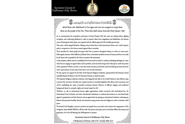 ونحن نعيش أجواء عاشوراء الحسين عليه السلام الذي خرج طلبا للإصلاح ومحاربة الفساد ومواجهة الباطل للحفاظ على الإسلام من الزيف والتحريف تكررت الجريمة النكراء لحرق القرآن الكريم بموافقة رسمية من الحكومة السويدية تلك الجريمة التي استهدفت في مضامينها مشاعر المسلمين واستفزازهم وسط صمت دولي أو رد فعل خجول لا يرتقي إلى حجم العمل المشين بحق مقدسات الإسلام.. تلك المقدسات التي سالت من أجل الحفاظ عليها الدماء على مر التاريخ وفي عصرنا الحالي كانت التضحيات الجسام بالمال والأنفس بعد صدور فتوى الدفاع الكفائي ليسطر الملبّون أروع الملاحم لحماية المقدسات.. ولا بد والحال هذه أن تتظافر الجهود وتتوحد الأصوات لمحاربة الأفكار المنحرفة في زمن تكالب فيه الإعداء على الإسلام ورموزه في حادثة حرق القرآن الكريم بحجة حرية التعبير فهي جريمة تؤدي إلى الاحتقان والكراهية وتتحمل الحكومة السويدية النتائج الوخيمة المؤدية الى أعمال التحريض العنصري.