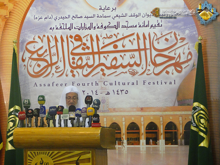 شاركت العتبة الكاظمية المقدسة بوفد ترأسه أمينها العام أ. د "جمال الدباغ" في حفل افتتاح فعاليات مهرجان السفير الثقافي الرابع الذي أقامته الأمانة العامة لمسجد الكوفة المعظم والمزارات الملحقة به، يوم السبت 5 شوال 1435هـ الموافق 2/8/2014م والذي يستمر لمدة ثلاثة أيام، وذلك تزامناً بيوم الكوفة يوم دخول مسلم بن عقيل "عليه السلام" مبعوثاً للإمام الحسين "عليه السلام" في الخامس من شوال سنة 60 للهجرة واحتفاءً بهذه الشخصية الخالدة ودورها الكبير في النهضة الحسينية، وقد رعى الحفل معالي رئيس ديوان الوقف الشيعي سماحة السيد "صالح الحيدري" وبحضور ممثلي العتبات المقدسة والمزارات الشريفة في العراق ونخبة من الشخصيات الدينية والعلمية والثقافية والسياسية والفكرية الوافدة من داخل وخارج العراق فضلاً عن حضور بعض رؤساء وأساتذة الجامعات العراقية. وشهد حفل الافتتاح فعاليات عدة استهلت بتلاوة معطرة من الذكر الحكيم وقراءة سورة الفاتحة المباركة ترحماً على أرواح شهدائنا الأبرار وكلمات بالمناسبة وعرضاً للأفلام الوثائقية، كما تم خلاله الإعلان عن أسماء الفائزين في جائزة السفير الكبرى للإبداع الثقافي والفكري في مجالات( القصة، والقصة القصيرة، والمسرحية، والخطابة، والرواية)، وقراءة رسالة المهرجان باللغة الانكليزية.