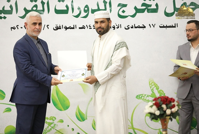 وأضاف: أن الدورات القرآنية فرصة قيمة وعظيمة لنا جميعا ولا يجب أن نفرط بها إذا ما عرفنا أن القرآن الكريم هو أول الثقلين ومن ثم الثقل الثاني عترة النبي المصطفى "صلى الله عليه وآله وسلم" ولا بد من التمسك بهما لضمان الهداية وعدم الضلال لهذا ينبغي علينا تعلم القرآن الكريم وفهم آياته والتقرب إلى الله عز وجل بالمداومة على تلاوة كتابه وتطبيق آياته وتعاليمه في حياتنا.. لذلك أوصانا الإمام جعفر الصّادق "عليه السلام" قائلا: (يَنْبغي للمؤمن أنْ لا يموت حتّى يَتعَلّم القرآنَ، أو يكونَ في تعلّمه)).