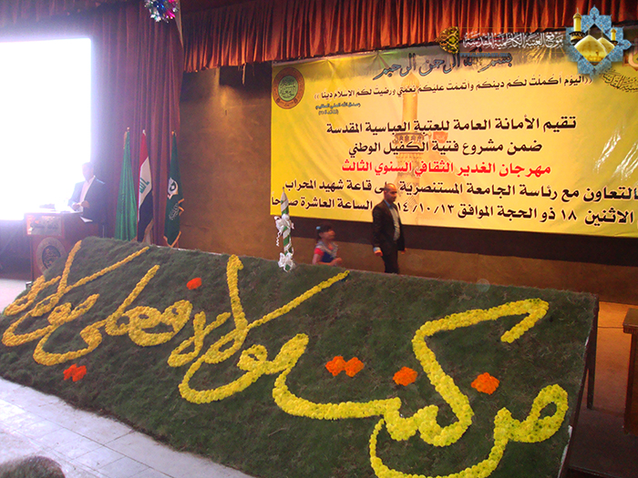 ابتهاجا بأفراح عيد الغدير الأغر حضر وفد العتبة الكاظمية المقدسة حفل افتتاح فعاليات مهرجان الغدير الثقافي السنوي الثالث الذي أقامته الأمانة العامة للعتبة العباسية المقدسة بالتعاون مع الجامعة المستنصرية وضمن مشروع فتية الكفيل الوطني .