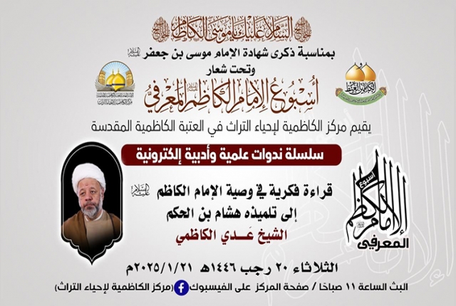 في رحاب الذكرى الأليمة، إذ تترددت عبارات الحزن في أروقة الزمن، لتحيي ذكرى استشهاد سجين بغداد موسى بن جعفر الكاظم "عليه السلام"، ذلك الإمام الذي أضاء دروب الإنسانية بمعارفه وسيرته الطاهرة، حين عاش مظلوماً محبوساً في ظلمات السجون، لكنه كان كالشمس التي تنير ولو خلف القضبان، ينثر الحكم، ويزرع بذور العلم والإيمان في أرجاء القلوب والعقول، وفي هذه الأيام التي تتشح بالسواد إجلالاً لذكراه، وبتوجيه من قبل خادم الإمامين الكاظمين الجوادين "عليهما السلام" الأمين العام للعتبة الكاظمية المقدسة الدكتور حيدر حسن الشمّري، انطلقت فعاليات أسبوع الإمام الكاظم "عليه السلام" المعرفي الأول، الذي أقامه مركز الكاظمية لإحياء التراث في العتبة الكاظمية المقدسة، بمشاركة نخبة الأساتذة والباحثين كل من: (الأستاذ الدكتور علي العبيدي، وفضيلة الشيخ عَدِي الكاظمي، وفضيلة الشيخ عماد الكاظمي، والمهندس عبد الكريم الدباغ، والشاعر محسن الموسوي، وفضيلة الشيخ منير الكاظمي، والباحث سمير موري)، والذي سيقدّم سلسلة من الندوات العلمية والأدبية عبر المنصات الإلكترونية، لتكون محطةً للتأمل في إمامنا الكاظم، وفرصة لإحياء معالم فكره النير، واستقاء الحكمة من فصول حياته الشريفة المليئة بالصبر والثبات على الحق حين اختزلت معاني التضحية والوفاء لله تعالى ولنبينا الأكرم "صلى الله عليه وآله وسلم" ورسالته السماوية.