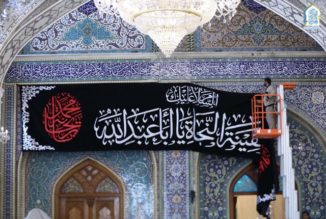 ها هو شهر محرم الحرام يطلّ علينا لنستقبله بمظاهر الحزن والأسى، وفيه يوم عاشوراء الأليمة، ذكرى شهادة أبي الأحرار الإمام الحسين "عليه السلام" وأهل بيته وأصحابه الأوفياء تلك الفاجعة العظيمة التي أبكت ملائكة السماء وما زالت تدمع لها قلوب المؤمنين من أتباع أهل البيت "عليهم السلام" في مشارق الأرض ومغاربها، حيث اتَّشحت رحاب الصحن الكاظمي الشريف بمظاهر الحزن والأسى إيذاناً للعزاء واستقبال مناسبة عاشوراء، إذ تم نشر السواد والكلمات النورانية في الحرم الشريف وعلى أعمدة الطارمات والأواوين للحرم المطهر.