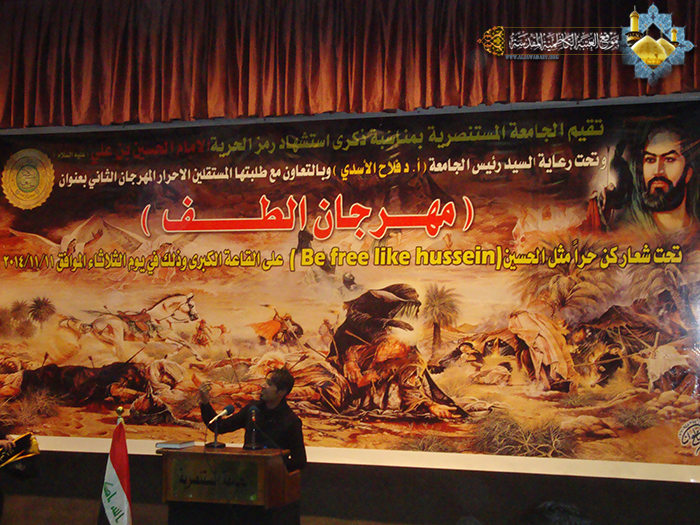 واقعة الطف وثورة الإمام الحسين "عليه السلام" عطاء مستمر ودائم، على مختلف العصور والدهور والأجيال، فهي بمثابة المشعل الذي ينير رسالة الحق نحو الأهداف الإنسانية السامية، ولابد من تواصل الأمانة العامة للعتبة الكاظمية المقدسة مع المؤسسة الجامعية لأجل نشر وتوطيد مبادئ الثورة الإصلاحية التي خرج من أجلها الإمام الحسين "عليه السلام" لدى تلك الشريحة الاجتماعية، إذ شاركت العتبة الكاظمية المقدسة في مهرجان الطف الثاني الذي أقامته الجامعة المستنصرية بذكرى استشهاد ضمير الإنسانية الإمام الحسين "عليه السلام" يوم الثلاثاء 11/11/2014م على القاعة الكبرى وتحت شعار : " كن حراً كما كان الحسين .. Be free like hussein " وحضره العديد من الشخصيات العلمية والأكاديمية والاجتماعية ونخبة من طلبة الجامعة المستنصرية، وشهد المهرجان إلقاء الكلمات والقصائد الشعرية في حب الإمام الحسين "عليه السلام" وعرض فلم سينمائي عن واقعة الطف، وفي ختام فعالياته قدم وفد خَدَمَة الإمامين الجوادين "عليهما السلام" المشارك تحيات الأمانة العامة للعتبة الكاظمية المقدسة إلى القائمين على إقامة هذا المهرجان متمنين لهم المزيد من التواصل في مثل هكذا تظاهرات فعاليات وثقافية كبيرة تصب في خدمة أئمة أهل البيت "عليهم السلام"، فضلاً عن كونها حافزاً لطلبة الجامعة بالاقتداء والالتزام بالمسيرة الحسينية المباركة .