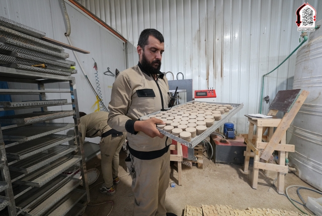 معمل تصنيع ترب الصلاة في العتبة الكاظمية المقدسة يواصل إنتاجه بطاقة عالية خلال موسم الأربعين