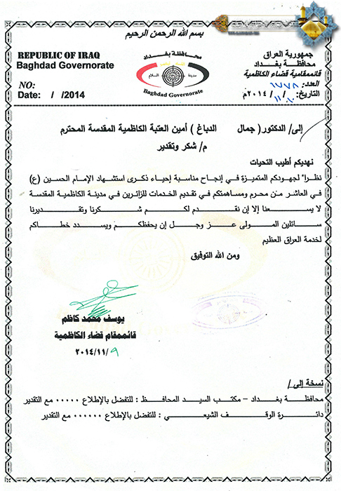 تقدمت قائمقامية مدينة الكاظمية المقدسة بالشكر والتقدير إلى الأمانة العامة للعتبة الكاظمية المقدسة لجهودهم المباركة وأدائهم المتميز بتشرفهم بتقديم أفضل الخدمات للزائرين الكرام وتوفير الأجواء المناسبة لهم، خلال أيام شهر محرم الحرام، سائلين المولى العلي القدير أن يسدد خطى الجميع ببركة الإمامين الجوادين "عليهما السلام" .