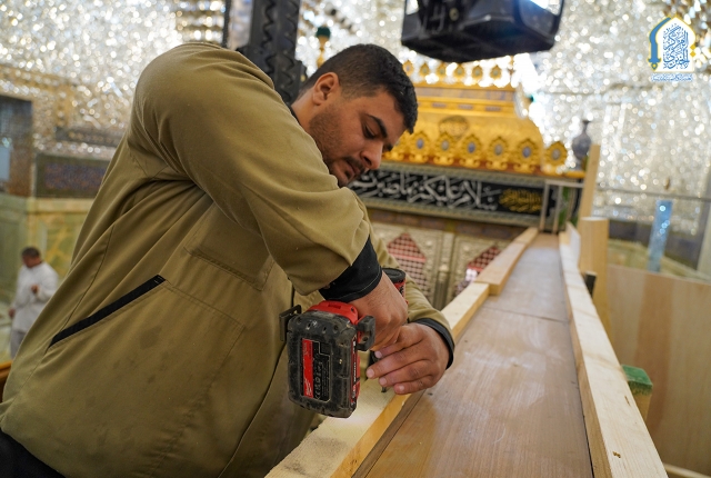 وحدة النجارة والألمنيوم تنفّذ أعمال نصب القواطع لتنظيم حركة الزائرين خلال الزيارة الرجبية