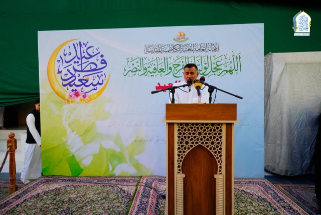 وشهدت شعائر صلاة عيد الفطر المبارك إلقاء خطبة عبادية دعا في مطلعها بتعجيل فرج مولانا صاحب العصر والزمان الإمام المهدي المنتظر "عجل الله تعالى فرجه الشريف"، وأكد في خطبته على مبدأ الطاعة والتقوى والخوف من الله والتماس التوبة والعودة إلى حضرته القدسية مستشهداً بشذرات من دعاء إمامنا زين العابدين علي بن الحسين السجاد "عليه السلام" في توديع شهر رمضان المبارك.