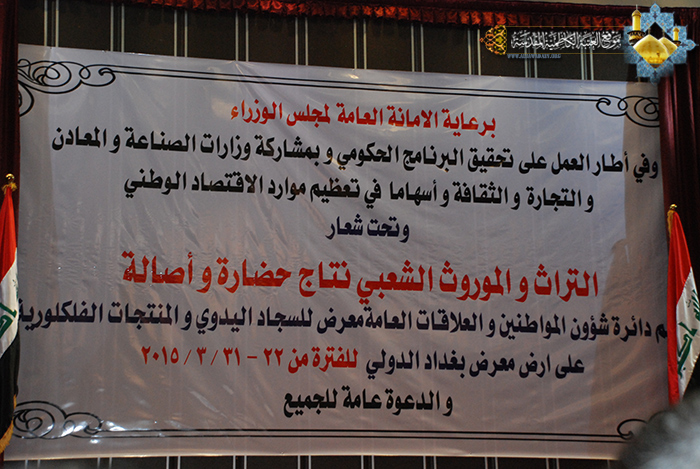 لبى وفد خَدَمَة العتبة الكاظمية المقدسة في قسم العلاقات العامة دعوة حضور فعاليات افتتاح معرض السجاد اليدوي والمنتجات الفلكلورية الذي أقامته وزارة الصناعة والمعادن بالتعاون مع وزارة الثقافة على أرض معرض بغداد الدولي يوم 22/3/2015م تحت شعار : " التراث والموروث الشعبي نتاج حضارة وأصالة "، والذي عرض خلاله الأعمال الفنية الرائعة التي عبرت عن التراث الأصيل والموروث الشعبي الذي جمع بين مدن ومناطق وقصبات العراق. وأكدت العتبة الكاظمية المقدسة بورشها الفنية ووحداتها الحرفية على اهتمامها الكبير بالتراث العراقي وحفاظها على جمال وروعة هذه الفنون العريقة ، وحرصها على تنميتها وتطويرها .