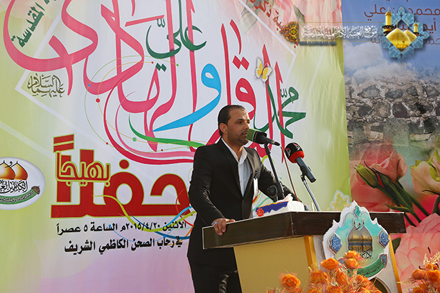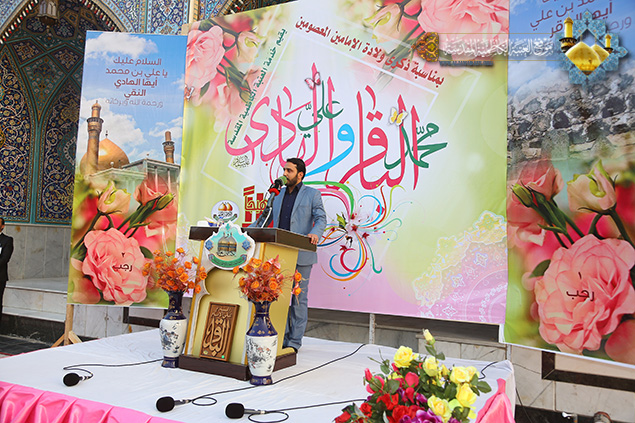 ينبغي أن نستثمر هاتين الولادتين الميمونتين في زيادة الحث على الاقتداء بنهج الأئمة المعصومين "عليهم السلام" وخطهم الرسالي والالتزام بالإيمان الحقيقي وأن يكون الجهاد في ساحات المعارك خالصاً في سبيل الله ودفاعاً عن الوطن العزيز والالتزام بتوجيهات المرجعية الرشيدة, كما ندعو الى المزيد من الجهاد في سبيل الله وبذل الغالي والنفيس تلبية لفتوى المرجعية الرشيدة , وأن ترعى عوائل الشهداء فهم أمانة في أعناقنا سائلين المولى القدير أن ينصر قوات الحشد الشعبي وقواتنا المسلحة وأن يتغمد شهداءنا بالرحمة ويسكنهم فسيح الجنات ويعجل بشفاء الجرحى.. " بعدها ارتقى المنصة الخطيب الحسيني سماحة الشيخ منير الكاظمي ليلقي في محاضرته القيّمة الضوء على شذرات من حياة الإمام الباقر ومسيرته الحافلة المعطاء متحدثاً عن هذه الشخصية التي توافرت كل المقومات والمؤهلات للزعامة والإمامة والقيادة والريادة حتى اضحى محط ثناء العلماء والفقهاء والفضلاء، مستشهداً بفضائله بلسان الدهر والعلماء الذين ملأت أسماؤهم ونتاجاتهم الآفاق. كما تناول جزءاً من حياة الإمام الهادي الذي تصدى للإمامة وهو في سن مبكر، ودوره الفاعل والذي تجسد بمدرسته الشريفة التي تخرج منها عدد كبير من العلماء والفقهاء، فضلاً عن دوره في المجادلات والمناظرات ومواجهته للمدارس الكلامية المنحرفة، والدفاع عن حقوق أهل بيت النبوة "عليهم السلام"، وتطرق إلى الإرث الفكري والحضاري الزاخر الذي تركه "عليه السلام" لأمة جده رسول الله "صلى الله عليه وآله" والتي لها أثر بالغ في نفوس المسلمين لما تحمله من قيمٍ ومعانٍ سامية. وشهد الحفل مشاركة لشاعر أهل البيت السيد نبيل أبو العيس بمجموعة قصائد رائعة ومنها هذه الأبيات: بحق الإمام الباقر "عليه السلام":