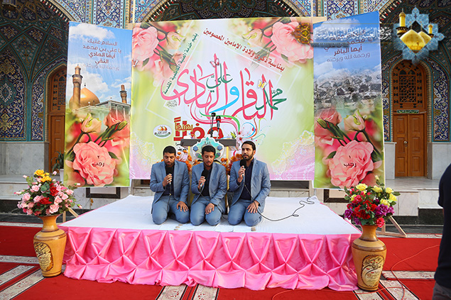 رَغمَ الأسىَ والغَمِ والأشجانِ ... نَشوانَ جِئتُ مُهنئاً إخواني فرحاً بميلادِ الهُدى لأبنِ الهُدى ... بِعليٍ الهادي إلى الإيمانِ بعدها صدحت حناجر فرقة إنشاد الجوادين بمجموعة من الموشحات والأناشيد الإسلامية وكان مسك ختامها بمشاركة الرادود الحسيني علي نجم بالردات الحسينية التي أضفى من خلالها روح البهجة والفرح والسرور في نفوس الحاضرين.
