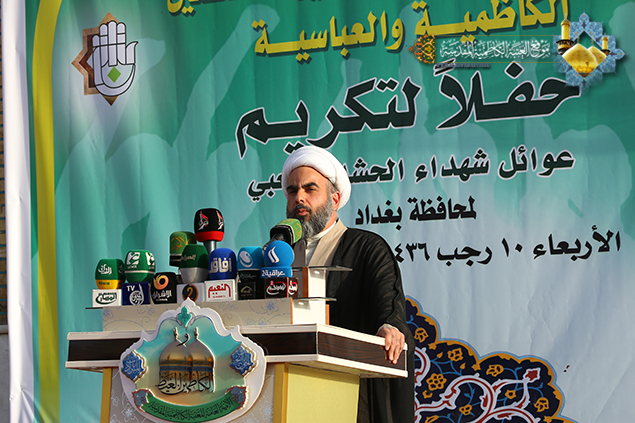 إكراماً للدماء الطاهرة التي نزفت من أجل العراق، وتقديراً لشهداء العقيدة والوطن السائرين في دروب التضحية والولاء والفداء، الذين عقدوا العزم لبذل أرواحهم ومهجهم لإعلاء كلمة الحق ونيل عظيم شرف الدنيا وسعادة الآخرة ، ملبين للنداء المقدس الذي أطلقته المرجعية العليا المتمثلة بسماحة آية الله العظمى السيد علي الحسيني السيستاني "دام ظله الوارف" في الجهاد الكفائي والدفاع عن العراق ومقدساته من دنس أعداء الله والإنسانية الإرهاب التكفيري. ومن منطلق الشعور بالمسؤولية تجاه هؤلاء المؤمنين وعوائلهم، أقامت الأمانتان العامتان للعتبتين المقدستين الكاظمية والعباسية عصر الاربعاء 10رجب الأصب 1436هـ الموافق 29/4/2015م في رحاب الصحن الكاظمي الشريف، حفل تكريم عوائل شهداء الحشد الشعبي في بغداد بحضور وكيل المرجعية العليا في مدينة الكاظمية المقدسة سماحة الشيخ حسين آل ياسين ورئيس ديوان الوقف الشيعي سماحة السيد علاء الموسوي ونائب الأمين العام للعتبة الكاظمية المقدسة السيد محمد الحيدري وأعضاء مجلس الإدارة وممثلي العتبة العباسية المقدسة ونخبة من السادة والمشايخ الفضلاء معتمدي المرجعية الرشيدة وعدد من الشخصيات الاجتماعية ومجاهدي الحشد الشعبي. استهل الحفل بتلاوة من الذكر الحكيم عطر بها مسامع الحاضرين الحاج "همام عدنان" بعدها ألقى سماحة الشيخ حسين آل ياسين كلمة المرجعية العليا المتمثلة بسماحة آية الله العظمى السيد علي الحسيني السيستاني قائلاً: " نقف بين أيدي الأمهات الرواحم والزوجات السواكن والآباء المعظمين والأطفال الأيتام بين آمالهم وآلامهم، نقف عبيداً لإحسان شهدائهم، فإن كان المعلم حرفاً يستحق الاتباع والعبودية بمعنى الطاعة، فكيف بهؤلاء الأبطال الذين قد علمونا دروساً في الذود عن الدين والقيم والوطن والمقدسات، ودروساً في نسيان كلّ الآلام والحرمان الذي يعانون منه، عندما هبوا مسرعين مبادرين متقربين إلى الله سبحانه وتعالى، مقتدين بالصالحين من محمد وآله الطاهرين، على بصيرة من أمرهم عندما لبّوا نداء نائب الإمام المنتظر "عجل الله فرجه الشريف" فتوى سماحة آية الله العظمى السيد السيستاني "دام ظله الوارف" ، والتي أيدها جميع مراجعنا في النجف الأشرف، لبّوها وهم يرون أنفسهم مقصربن في حق الدين والأوطان وكلهم نداء لواعية الإمام الحسين "عليه السلام"، ونحن تحت ظلال الإمامين الهمامين الجوادين "عليهما السلام" نهنئ هؤلاء الأبطال المتميزين في إقامتهم لشعائر الله في ساحات القتال ذوداً عن مبادئهم وطاعة لمرجعيتهم..