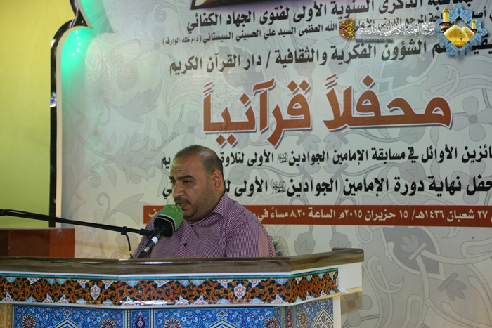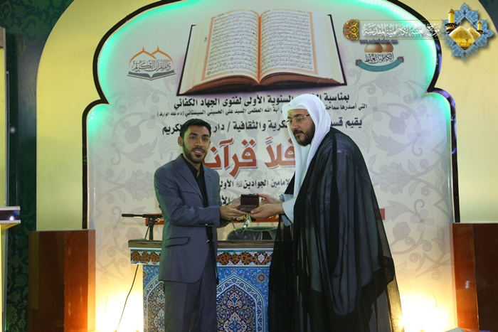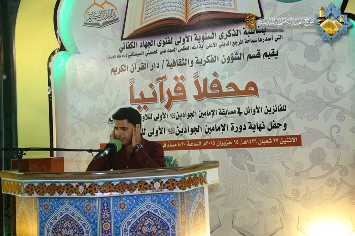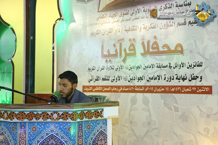 تراتيل قرآنية وتلاوات مباركة تعطرت بها أجواء الصحن الكاظمي الشريف مساء الاثنين 27 شعبان الخير 1436الموافق 15 حزيران 2015 بمناسبة الذكرى السنوية الأولى لفتوى الجهاد الكفائي التي أطلقها سماحة المرجع الديني الأعلى آية الله العظمى السيد علي الحسيني السيستاني "دام ظله الوارف"، إذ أقامت الأمانة العامة للعتبة الكاظمية المقدسة/ قسم الشؤون الفكرية ـ دار القرآن الكريم محفلها القرآني، بحضور نخبة من الأساتذة والقراء والمهتمين بالشأن القرآني، وجمع غفير من زائري الإمامين الجوادين "عليهما السلام"، واستضيف خلاله الفائزين الأوائل في مسابقة الإمامين الجوادين "عليهما السلام" الأولى لتلاوة القرآن الكريم، حيث شاركوا بأصواتهم الشجية بتلاوة آيات بينات من الذكر الحكيم شنفوا بها أسماع الحاضرين. كما احتفى الحضور بنهاية دورة الجوادين "عليهما السلام" الأولى للنغم القرآني، وتميز طلبة الدورة بمشاركاتهم في هذا المحفل.