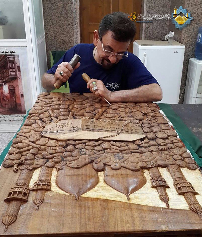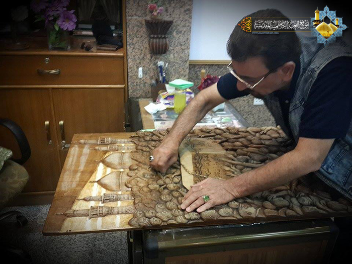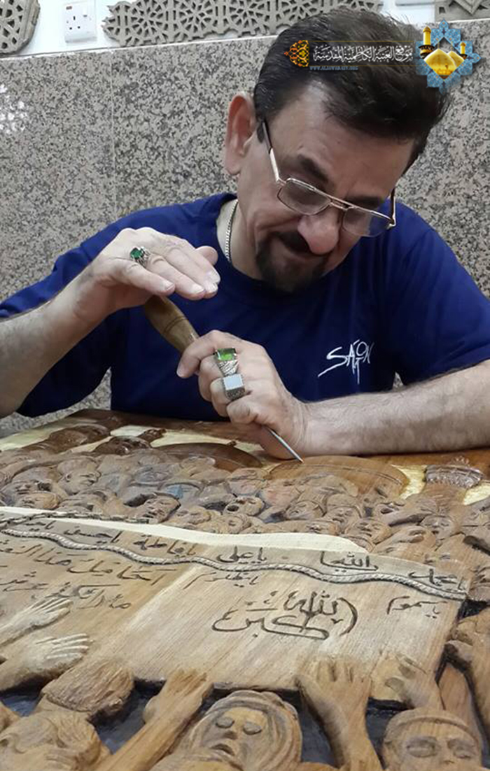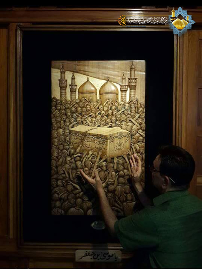 أنامل الإبداع لخادم الجوادين "عليهما السلام" استطاعت اليوم أن تجسد لنا لوحة فنية جديدة لتضاف إلى سجل الابدعات الثقافية لشعبة النقش والزخرفة في العتبة الكاظمية المقدسة، لوحة بل هي أكثر من لوحة حملت في طياتها أفكارٍ ومعانٍ وأسرارٍ، نستطيع أن نتعرف عليها في حديثنا مع خادم الإمامين الجوادين الأستاذ إبراهيم النقاش حيث تحدث قائلاً: الكلّ يعلم مدى حجم الزيارات المليونية التي تشهدها العتبة الكاظمية المقدسة وعلى وجه الخصوص ذكرى استشهاد المعذب في قعر السجون وظلم المطامير الإمام موسى بن جعفر الكاظم "عليه السلام" وكيف تُستقبل هذه المناسبة الأليمة من قبل المؤمنين والموالين وهم يستذكرون منزلته ومقامه العظيم لدى الباري عز وجل، وكيف يعيشون تلك الواقعة، فهناك مراسم خاصة تشهدها العتبة الكاظمية المقدسة عند دخول النعش الرمزي إلى الصحن الشريف، وتلك الأجواء المباركة بمنظرها المهيب المشحونة بالحب والإيمان والولاء المطلق من قبل تلك الحشود، فيها من الصور والمشاهد والمواقف التي لا يمكن أن تمحى من الذاكرة، فمن هذا المنطلق تولدت فكرة عمل جديد يخلد تلك المراسم واستطعنا بفضل الله تعالى وببركة الإمامين الجوادين "عليهما السلام" أن تجسدها بلوحة فنية ونساهم من خلالها بنقل الصورة الولائية الخالدة لموالي أئمة أهل البيت "عليهم السلام" .