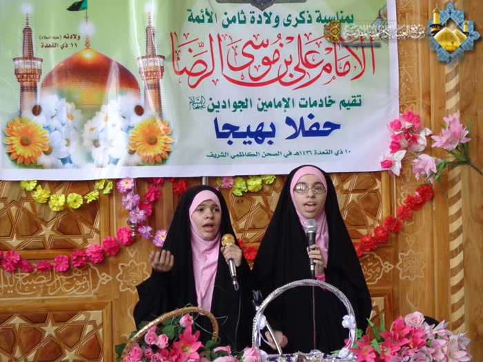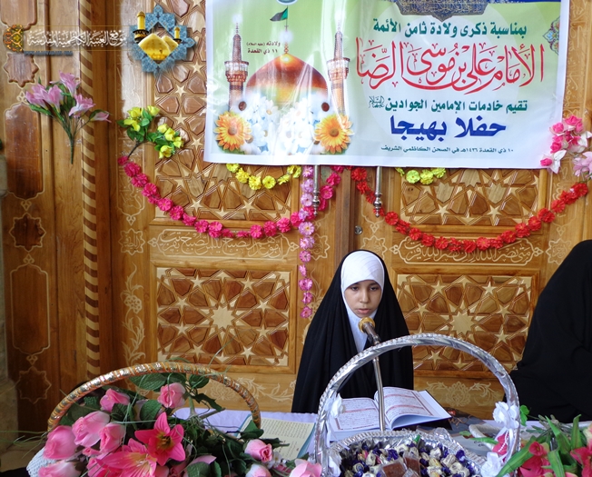 وسط الأفراح الغامرة وبأجواء تملئها البهجة والسرور بمولد ثامن الأنوار المحمدية, وشمس شموس الدوحة الهاشمية الإمام علي بن موسى الرضا "عليه السلام", أقامت خادمات العتبة الكاظمية المقدسة حفلاً رضوياً بهيجاً في طارمة صحن قريش, إذ تنوعت الفقرات والفعاليات التي تخللت الحفل فقد استهلت بتلاوة معطرة من آيات الذكر الحكيم, تلتها قراءة دعاء العهد المبارك تجديداً للبيعة مع إمام زماننا المنتظر المهدي "عجل الله فرجه الشريف", بعدها تمت قراءة زيارة الإمام الرضا "عليه السلام" سائلين المولى عز وجل أن يرزقنا زيارته في الدنيا وشفاعته في الآخرة, وتضمن البرنامج محاضرة فقهية في ما يخص أحكام الصلاة. واشتمل الحفل على إقامة مسابقة لإضافة البهجة والفائدة على أجوائه لما حوته من معلومات دينية وفقهية متنوعة, ووزعت الجوائز على الزائرات الفائزات من بركات الإمامين الجوادين "عليهما السلام"، وكانت هناك مشاركة لطالبات الدورة القرآنية حيث قَدَّمنَ خلالها الأناشيد والموشحات الدينية. وأخيراً أختتم الحفل بقراءة حديث الكساء الشريف لقضاء حوائج المؤمنين والمؤمنات والدعاء للجميع بالخير والعافية وخصوصاً للمجاهدين في سبيل الله سائلين المولى أن ينصرهم نصراً عزيزاً.