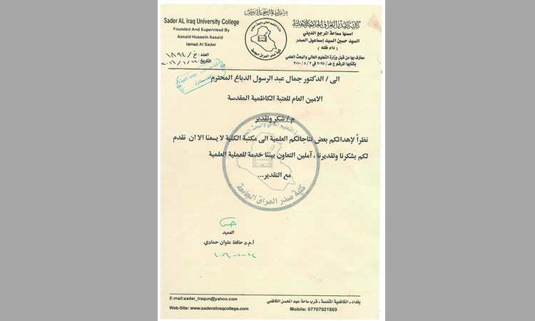 عمادة كلية صدر العراق الجامعة تقدم شكرها وتقديرها إلى الأمين العام للعتبة الكاظمية المقدسة