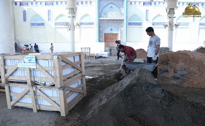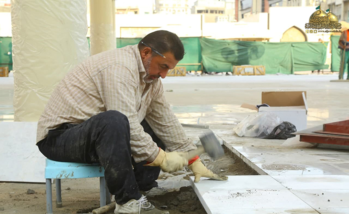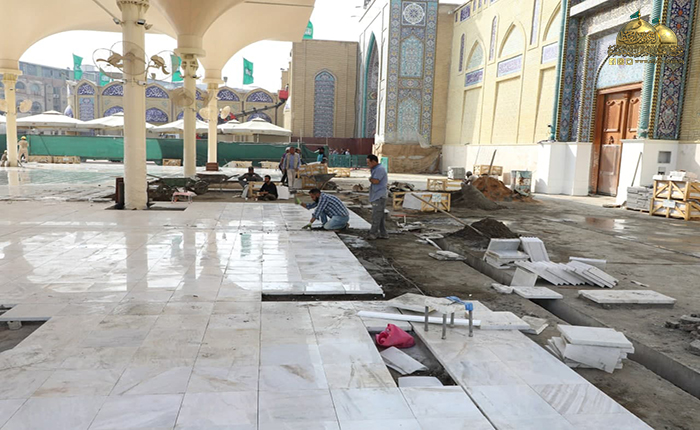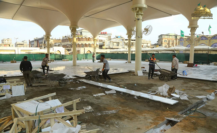 وأضاف: أما عن طبيعة مواد الإكساء حيث تم اختيار أجود انواع مرمر والكرانيت ذو جودة عالية وبقياسات مختلفة، وبسُمك (٤ سم) للأرضية، كما أُجريت عليه الفحوصات من ناحية قوة التحمّل، وثباتية اللون ومقدار الامتصاص، ومدى تأثره بدرجات الحرارة العالية، فضلاً عن تثبيت القطع المرمرية بشكل دقيق ومتناسق في غاية الجمال والروعة والإبداع.