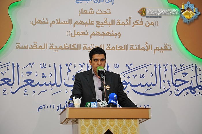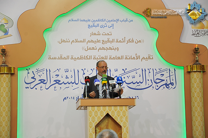 وأضاف قائلاً: لقد حرصت الأمانة العامة للعتبة الكاظمية المقدسة على إقامة المهرجان الشعري ورعايته عاماً بعد عام حرصاً منها على خلق فضاءات ومساحات واسعة للإبداع، تحتضن فيها المواهب والقدرات الأدبية لتنتج مزايا وفنوناً شعرية تعبر عن خصوصية لآل البيت "عليهم السلام" ذات مستوى عالٍ من العطاء والإبداع، وكان دور لجنة تقويم النصوص اختيار ما هو أفضل لأجل أن يكون الاختيار مميزا لهذا العام أملاً منها أن يصبح المهرجان السنوي للشعر العربي في العتبة الكاظمية المقدسة مضماراً يتبارى ويتسابق فيه المبدعون من الشعراء، ونؤكد ذلك أن القصائد المختارة للمشاركة لهذا العام هي (27) قصيدة من بين (58) قصيدة وردت للجنة المنظمة.."