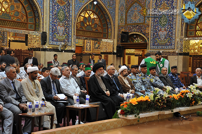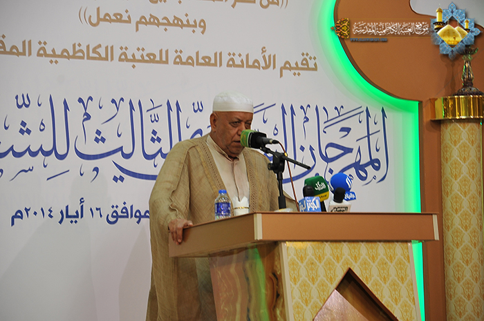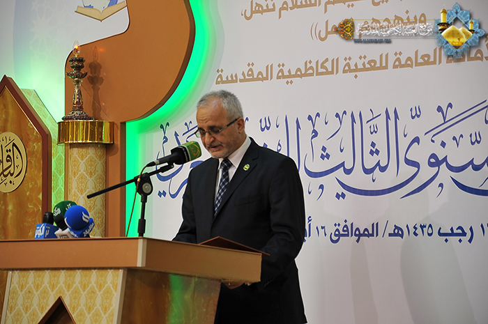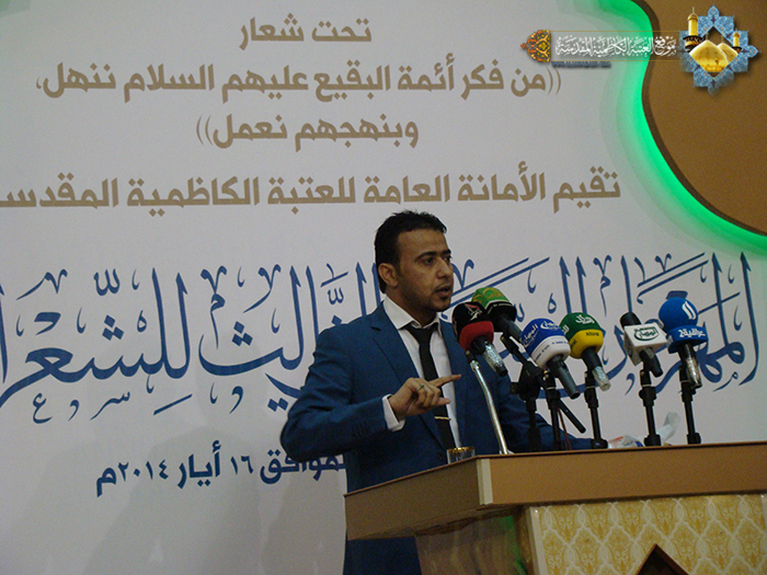 فتحت العتبة الكاظمية المقدسة أبوابها مشرعةً أمام ينابيع الفكر وفضاءات الثقافة والإبداع الأصيل، أمام الشعر والشعراء والكلمة الصادقة، أمام المفردات الجميلة في لغة الضاد، حيث مزجت بين ألوان الثقافة المتنوعة وخلاصة الأفكار، لتنسج من الخيال الواسع والإحساس المرهف أروع الصور الشعرية، وتَرسمُ لوحات وجدانية رائعة تنم عن حب أئمة البقيع (عليهم السلام)، وتسهم بتلك النتاجات المباركة رفد الحركة الأدبية والثقافية وإحياء التراث العربي الأصيل والحفاظ على الهوية الشعرية لتنير بها طريق الأجيال القادمة، إذ انطلقت صباح يوم الجمعة 16رجب الأصب 1435هـ الموافق16/5/2014م، في قاعة مضيف الإمامين الكاظمين (عليهما السلام) وقائع فعاليات المهرجان الشعري السنوي الثالث التي درجت على تنظيمه سنوياً الأمانة العامة للعتبة الكاظمية المقدسة، والمنعقد تحت شعار: " من فكر ائمة البقيع(عليهم السلام) ننهل وبنهجهم نعمل"، وحضر حفل الافتتاح الأمين العام للعتبة الكاظمية المقدسة أ.د "جمال الدباغ" وأعضاء مجلس الإدارة والشخصيات الدينية وخَدَمَة الإمامين الجوادين وكوكبة من الأدباء والكتّاب والمثقفين المتذوقين للشعر العربي الفصيح، وبمشاركة نخبة من الشعراء الذين حضروا من مختلف محافظات عراقنا العزيز، جاءوا ليساهموا برفيف نبضات قلوبهم ويظلوا بظلال قصائدهم الغراء في هذا الملتقى الأدبي. استهل حفل الافتتاح بتلاوة آيات مباركة من القرآن الحكيم شنّف بها القارئ الحاج "محمد حسين الشامي" أسماع الحاضرين بعدها صدحت حناجر فرقة إنشاد الجوادين بقراءة "أنشودة الفردوس"، تلتها كلمة الأمانة العامة للعتبة الكاظمية المقدسة وألقاها أمينها العام أ.د "جمال الدباغ" وبيّن فيها قائلاً: " نجتمع في هذه الرحاب الطاهرة لنحتفي في مهرجاننا السنوي هذا بأئمة كانوا وما زالوا قدوة ومنارا للإنسانية، إذ تركوا لنا إرثا فكريا في جميع مناحي الحياة، وهذه التركة تلقي علينا مسؤولية تأريخية لحمل رسالتهم ونشرها عبر الأجيال، ولعل من وسائل النشر والتوثيق والتثقيف هو فن الشعر العربي، وما نحن بصددهم اليوم هم أئمة أربعة تشرف بضم أجسادهم ثرى البقيع..