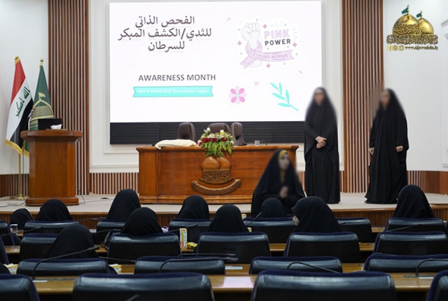 دأبت الأمانة العامة للعتبة الكاظمية المقدسة على نشر الوعي الصحي والثقافي بين الأوساط النسوية من الخادمات بغية الارتقاء بالمستوى الثقافي والمعرفي وتهيئة الأجواء الصحية الملائمة لهن، حيث أقيمت في قاعة سيدنا الحمزة بن عبد المطلب "عليه السلام" الندوة العلمية الصحية عن الكشف المبكر لسرطان الثدي، بالتنسيق مع وحدة التدريب والتأهيل في العتبة المقدسة والتعاون مع جامعة بغداد/ كلية التمريض، وألقت الدكتورة (زهراء حسين) محاضرة استعرضت فيها أهمية هذه الندوة، وأعباء هذا الداء ومخاطره، وضرورة قيام كل امرأة بهذه الفحوصات وإجراء عملية الرصد المبكر، كما بينت عدة وصايا مهمة حول سبل الوقاية من مرض سرطان الثدي والتذكير بأعراضه وأهم مسبباته وطرق علاجه والحد من انتشاره، وكشفت عن أنواع الفحوصات التي يجب على كل امرأة تجاوزت سن الأربعين إجراؤها لإنقاذ حياتها والحفاظ على صحتها لتحقيق السعادة لأسرتها والمساهمة في بناء وخدمة مجتمعها والنهوض به، وذكرت أن الفحص يكون على أنواع عدة: الفحص الذاتي، والفحص السريري، والفحص الإشعاعي، وتابعت حديثها بسلسلة من الإرشادات والنصائح العامة.