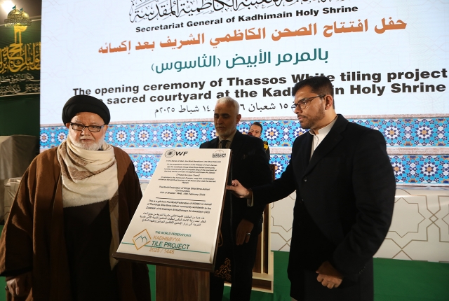 بعد ذلك دعا الأمين العام الحضور الأكارم لإزاحة السِتار عن اللوحة التذكارية التي تُخلّد هذا الإنجاز التاريخي المتمثل بإتمام وتسليم مشروع إكساء المرمر الثاسوس.