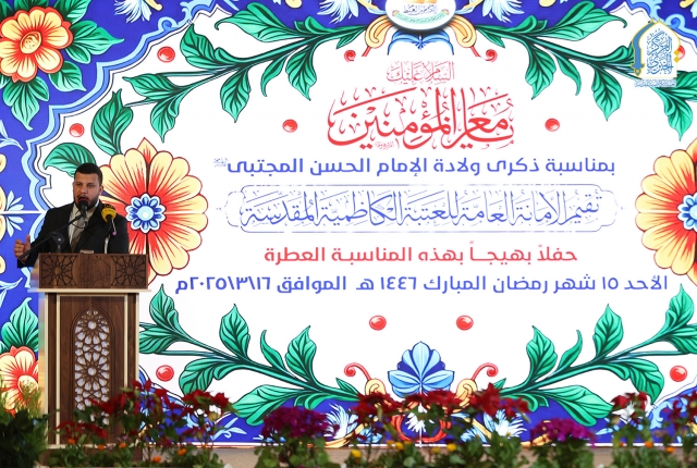 وأضاف: ينبغي أن نلتفت لشبابنا الذين يواجهون هجمة شرسة من قبل أعداء الإسلام، فالعدو يسخّر إمكاناته المادية والمعنوية والفنية لاستهدافهم، ولا بد لنا من استثمار هذه المناسبات إذ لا نحتفي بكلمات فقط بل يجب أن نحتفي بالمواقف وعليه أن نتخذ من إمامنا الحسن "عليه السلام" الأسوة الحسنة في طريقنا إلى الله "عز وجل" وتجديد دعوتنا بالتحلّي بالمنهج الحَسني القويم).