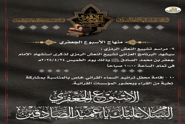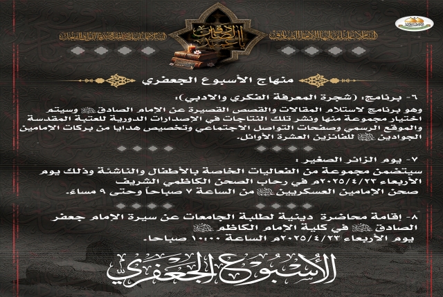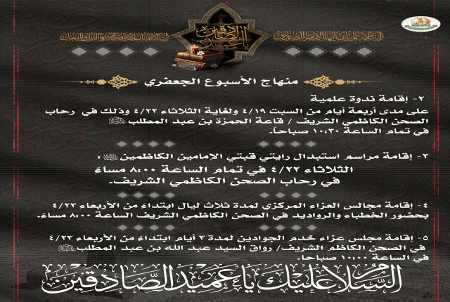 ويتضمن هذا الأسبوع باقة متنوعة من البرامج الفكرية والثقافية والإعلامية والخدمية، التي تستلهم من سيرة الإمام "عليه السلام" عبق العلم، ونور الهداية، وروح الرسالة. وتشمل هذه الفعاليات: محفلًا قرآنيًا يُهدى ثوابه إلى إمامنا الصادق "عليه السلام"، وسلسلة المجالس العزائية والتأبينية، مسابقة معرفية من خلال مطوية ستوزع على الزائرين الكرام تُبرز الإرث العلمي للإمام "عليه السلام"، وندوات علمية وحوارية تُقام عبر المنصة الكاظمية، وبرامج فكرية وأدبية تسلط الضوء على معالم شخصيته المباركة، وفعاليات يوم الزائر الصغير المخصصة للطفولة لغرس القيم الصادقية في نفوس الناشئة، ومراسم رفع الرايات السوداء فوق قباب العتبات المقدسة والمزارات الشريفة، إيذانًا بإعلان الحِداد في هذه الذكرى الأليمة.