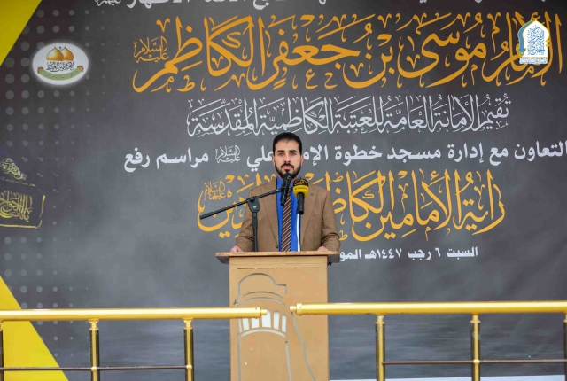 وأوضح: إنَّ الأمانةَ العامّةَ للعتبةِ الكاظميّةِ المقدّسةِ وهي تُشاركُكم هذه المناسبةَ العزيزةَ، تدعو الموالينَ جميعًا إلى استلهامِ الدروسِ والعِبَرِ من سيرةِ الإمامِ الكاظمِ "عليهِ السلام" وتَرجَمتِها سلوكًا عمليًّا في حياتِنا اليوميّة من خلال التمسّكِ بالأخلاقِ وتعزيزِ روحِ التعايشِ وخدمةِ المجتمعِ، والوقوفِ صفًّا واحدًا بوجهِ الفسادِ والانحرافِ ونُصرةِ الحقِّ).