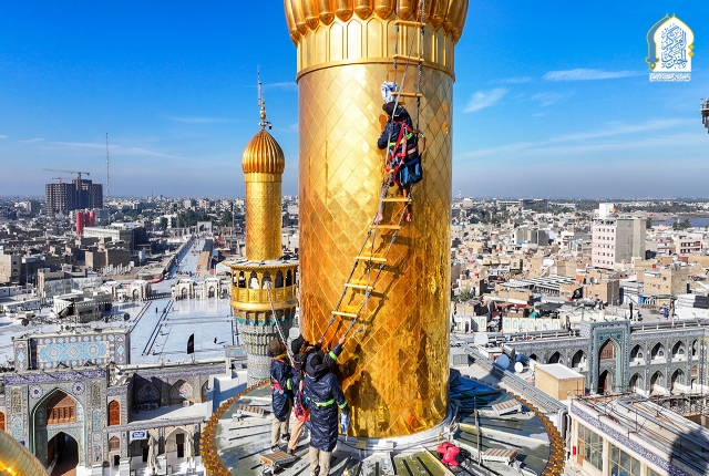 أعمال التنظيف والجلي تشهدها مآذن وقبتا حرم الإمامين الكاظمين "عليهما السلام"