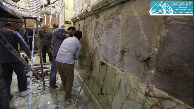 على بركة الله تعالى باشرت ملاكات قسم الشؤون الهندسية في العتبة الكاظمية المقدسة بمشروع إعادة إكساء أرضية وجدران حرم الإمامين الكاظمين "عليهما السلام"، إذ بدأت بالمرحلة الأولى وهي إزالة المرمر والطبقات الإكسائية القديمة للأرضية والجدران، ورفع الخرسانة القديمة، حيث أن الأعمال تجري ضمن المراحل والمقاطع التي تم من خلالها تقسيم الحرم المطهر، في الوقت ذاته يبذل العاملون المزيد من الجهود لأجل إنجاز العمل ضمن التوقيتات الزمنية وضمن المواصفات التصميمية والتنفيذية المُعدّة للمشروع.